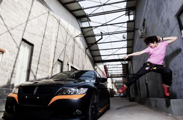 李天一与自己改装的爱车拍写真。