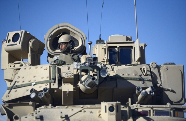 2013年2月24日,美国陆军驻堪萨斯州赖利堡第1步兵师第2装甲旅战斗队士兵驾驶M2A3布雷德利步兵战车群,在美国加利福尼亚州欧文堡的国家训练中心,进行实战演练。M2A3是布雷德利系列战车的最新改进型号。