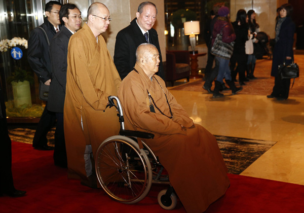 2月24日晚,星云大师随国民党荣誉主席连战抵达北京,图为他到达下榻酒店。