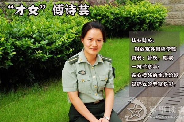 “才女”傅诗芸。傅诗芸是一个从名字里就透露着“才气”的女孩儿。唱歌、跳舞、乐器 傅诗芸都样样精通。然而这位才女起初对于交换站的生活却有点不太适应。初来交换站,傅诗芸感到和在学校大不一样,每天无论是上机房还是开饭都要集合站队, 这让傅诗芸很不适应,不像在学校里那么自由自在。在机房跟班值勤时傅诗芸也感到原来通信工作是那么的枯燥乏味,而且在机房的秩序还必须那么正规。让傅诗芸 印象最深刻的还要数在交换站第一次参加紧急集合。当时毫无准备的她不仅最后一个下楼,还带错了装具,这让傅诗芸感到非常丢人,同时也找到了自己的差距。之 后傅诗芸开始努力地适应连队生活,不断的改掉自己从前一些娇气的坏毛病,我们发现这个女孩已经慢慢地融入到连队生活中了。八一晚会,傅诗芸还利用自己的特 长,为晚会节目《丰碑》制作了视频,这让许多官兵都刮目相看,大家都说才女不愧是才女。      “邻家女”蒲琳。爱好唱歌和写作的蒲琳看上去总会给人一种邻家女孩的感觉。蒲琳说在交换站当兵锻炼期间自己找到了许多差距,首先是找到了学校与基层部队的 差距,到了连队才知道什么才是真正的当兵生活,同时还找到了当学员与当兵的差距,现在才知道要当好一名合格兵不容易。此外自己还经历了很多第一次:第一次 登台演出,第一次写新闻稿,第一次当队列指挥等等。让蒲琳感触最深的还要属八一晚会的舞台布置了,在接到任务后,蒲琳与其他几名学员一起奋战了两天两夜, 终于圆满完成了会场布置任务。在看到自己通过艰辛劳动换来的成果时,蒲琳终于第一次有了这么大的成就感,这也是她当兵锻炼最大的收获。