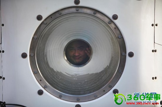 6月15日,试航员叶聪通过“蛟龙”号观察窗向外挥手。北京时间15日7时,在西太平洋马里亚纳海沟试验区,3名试航员乘“蛟龙”号载人潜水器开始进行7000米级海试第一次下潜试验。